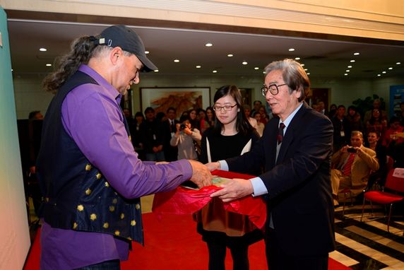 组委会同期举办了2014年度获奖作品展览,外国摄影爱好者们捧着奖杯在自己的作品前合影留念,和朋友们讨论交流摄影经验和技巧,颁奖仪式成为了摄影爱好者们的盛大聚会。