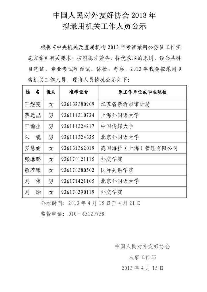 中国人民对外友好协会2013年拟录用机关工作人员公示