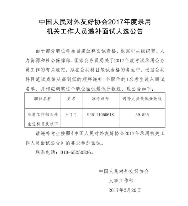 中国人民对外友好协会2017年度录用机关工作人员递补面试人选公告