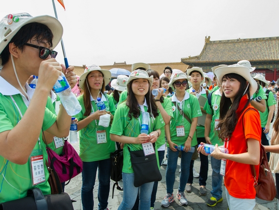 Chinese volunteer worked as a tour guide for the Korean students(at Forbidden City)